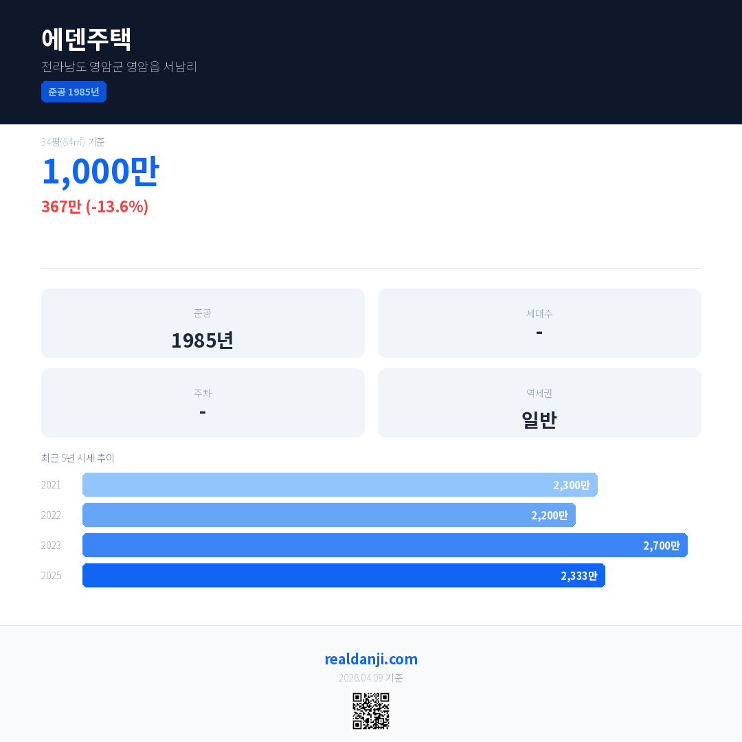 에덴주택 국민평형 기준 2025년 평균 거래가는 2,333만으로, 전년 대비 13.6% 하락 했습니다.