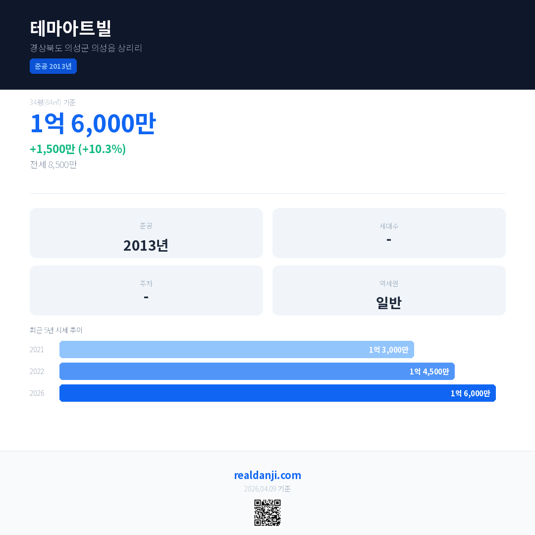 테마아트빌 국민평형 기준 2026년 평균 거래가는 1억 6,000만으로, 전년 대비 10.3% 상승 했습니다.