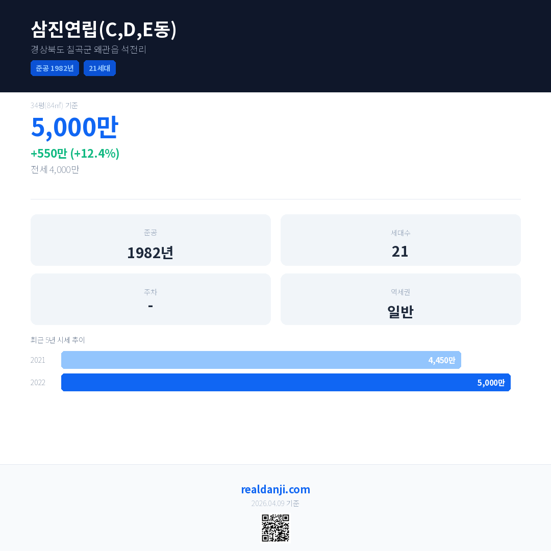 삼진연립(C,D,E동) 최근 거래가는 5,000만입니다. (2022-04)
