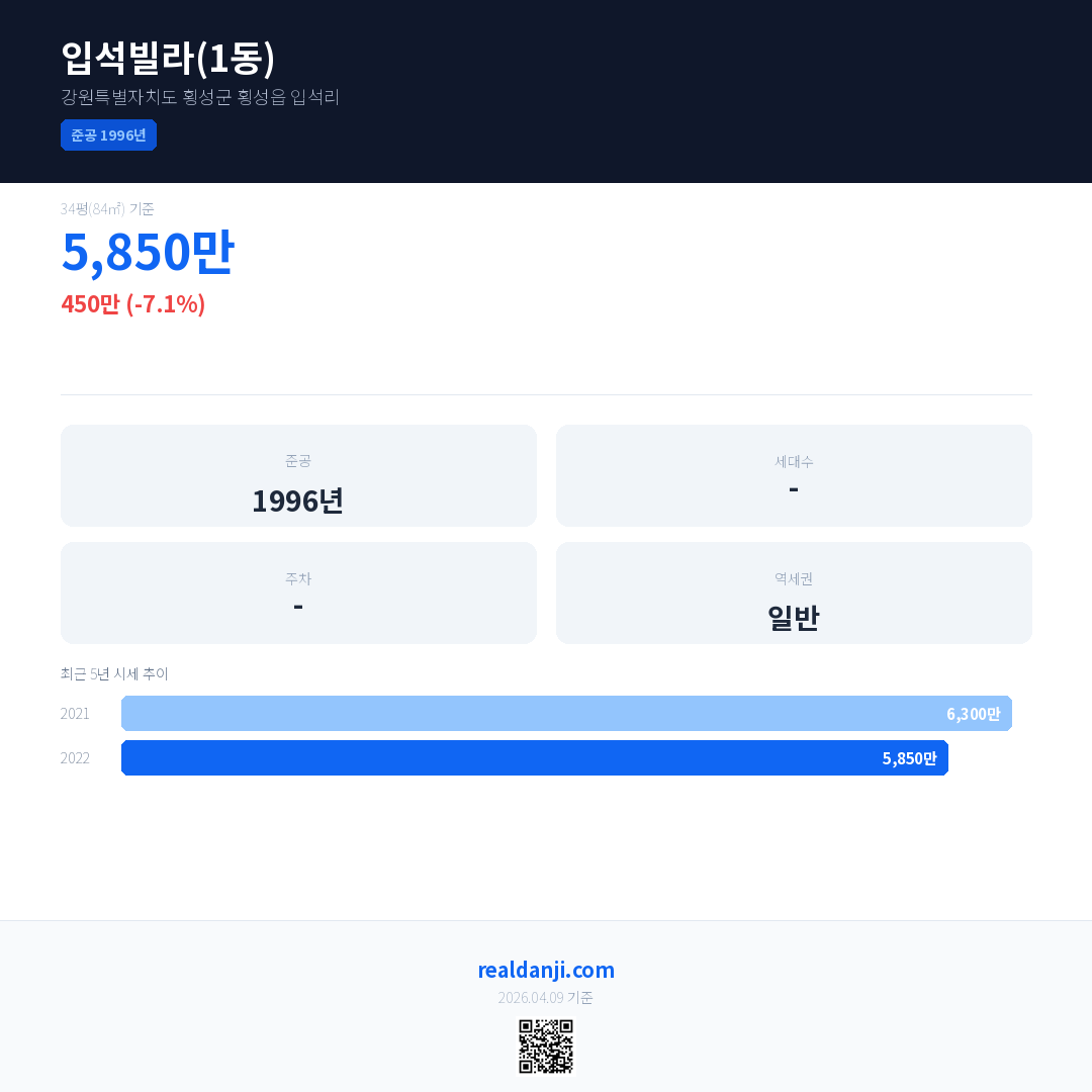 입석빌라(1동) 국민평형 기준 2022년 평균 거래가는 5,850만으로, 전년 대비 7.1% 하락 했습니다.