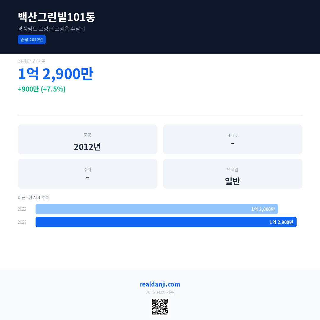백산그린빌101동은(는) 2012년에 준공되었으며, 현재 14년차입니다.