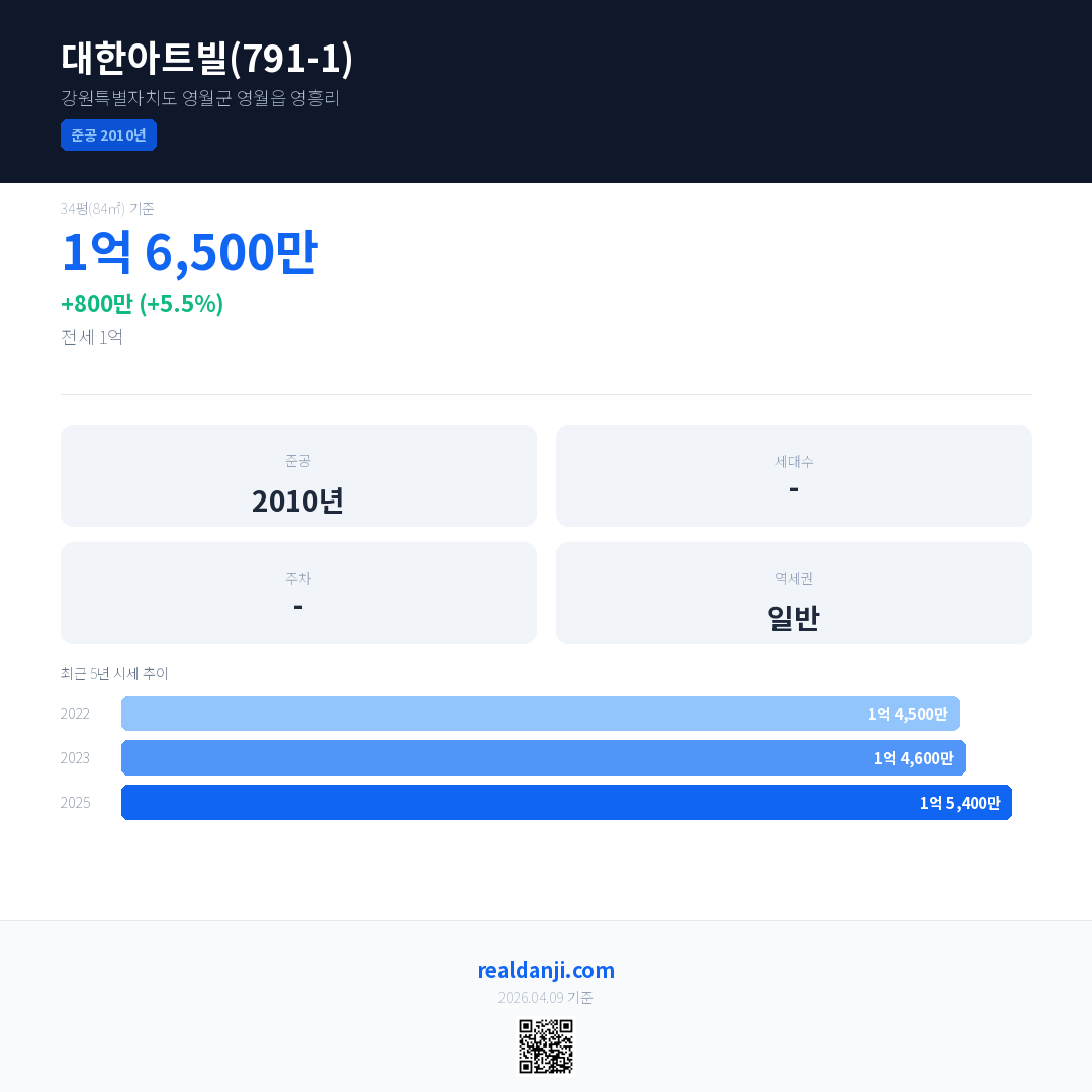 대한아트빌(791-1) 최근 거래가는 1억 6,500만입니다. (2025-07)
