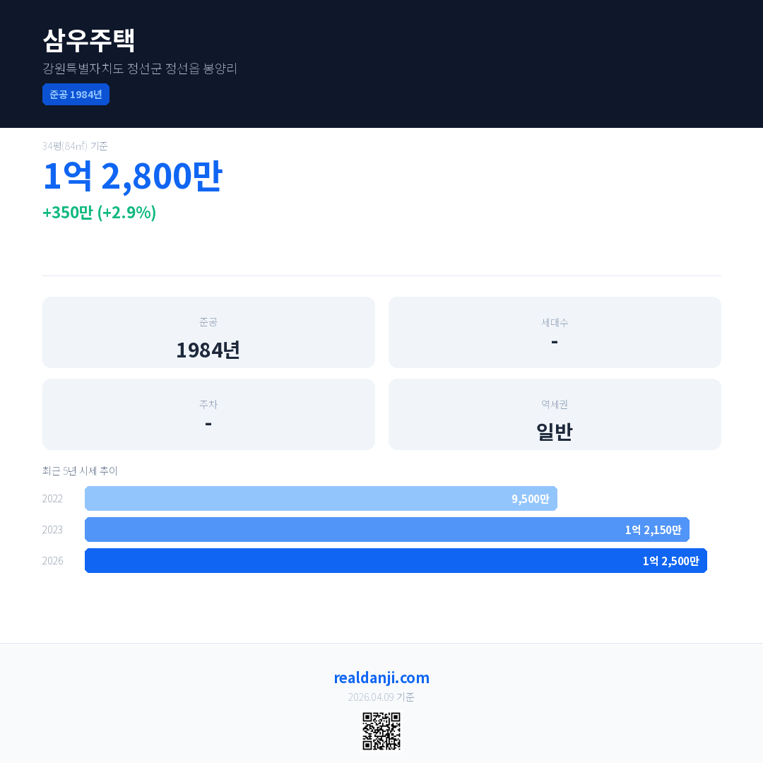 삼우주택 국민평형 기준 2026년 평균 거래가는 1억 2,500만으로, 전년 대비 2.9% 상승 했습니다.
