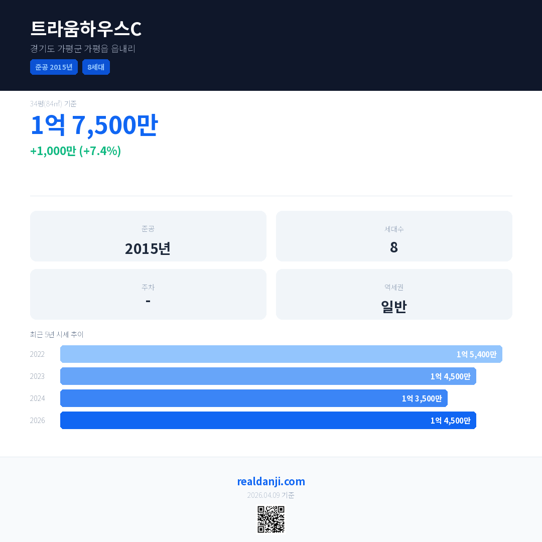 트라움하우스C 국민평형 기준 2026년 평균 거래가는 1억 4,500만으로, 전년 대비 7.4% 상승 했습니다.