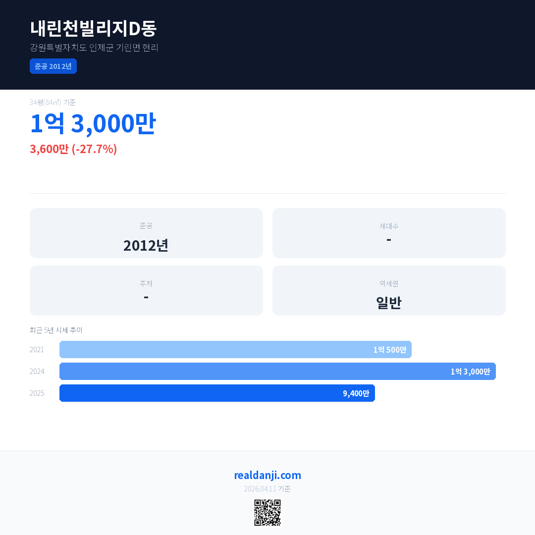 내린천빌리지D동 국민평형 기준 2025년 평균 거래가는 9,400만으로, 전년 대비 27.7% 하락 했습니다.