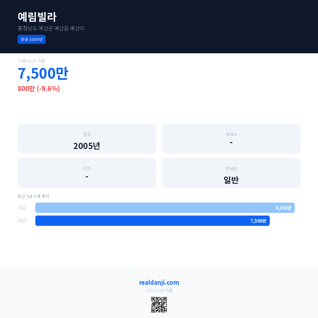예림빌라 국민평형 기준 2023년 평균 거래가는 7,500만으로, 전년 대비 9.6% 하락 했습니다.