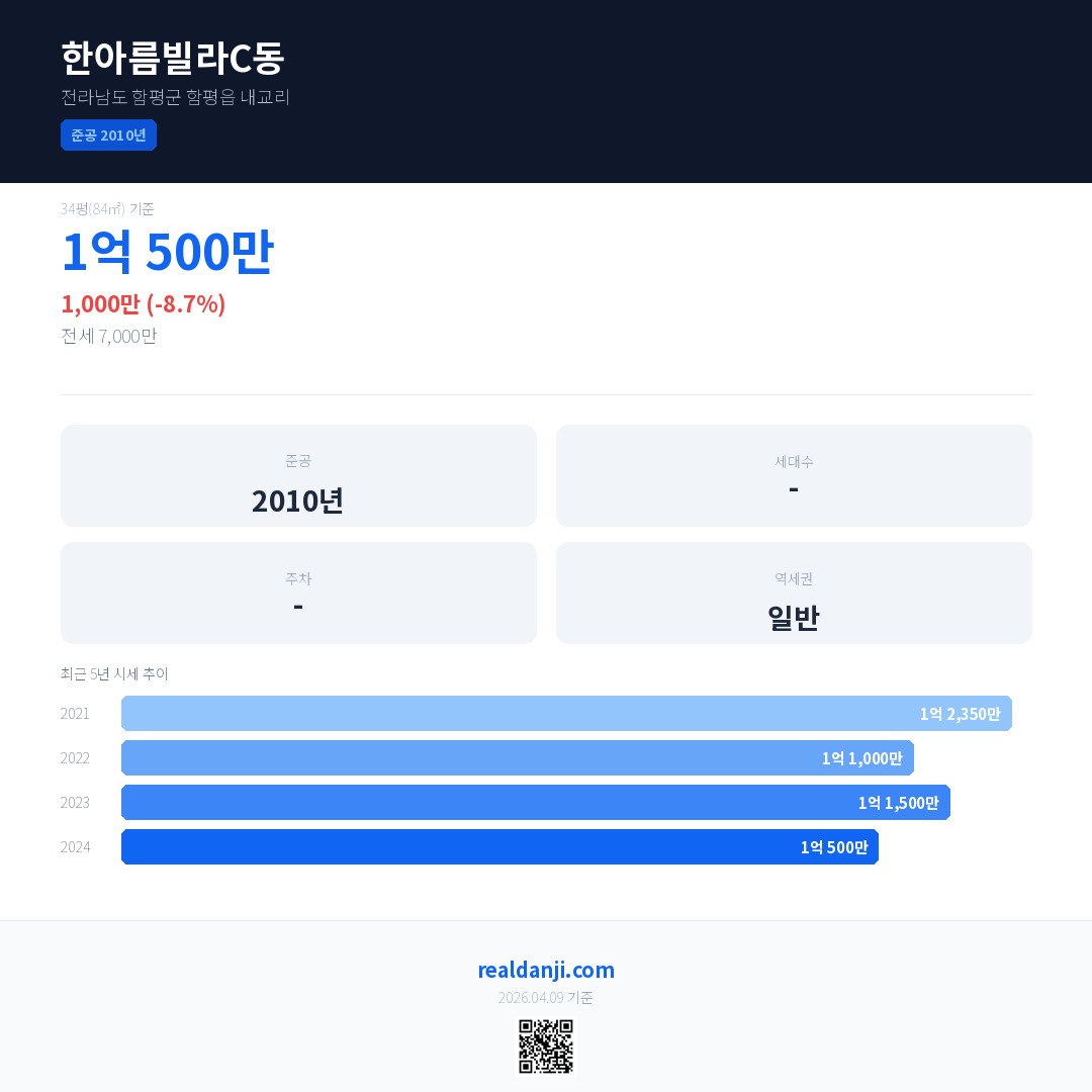 한아름빌라C동은(는) 2010년에 준공되었으며, 현재 16년차입니다.