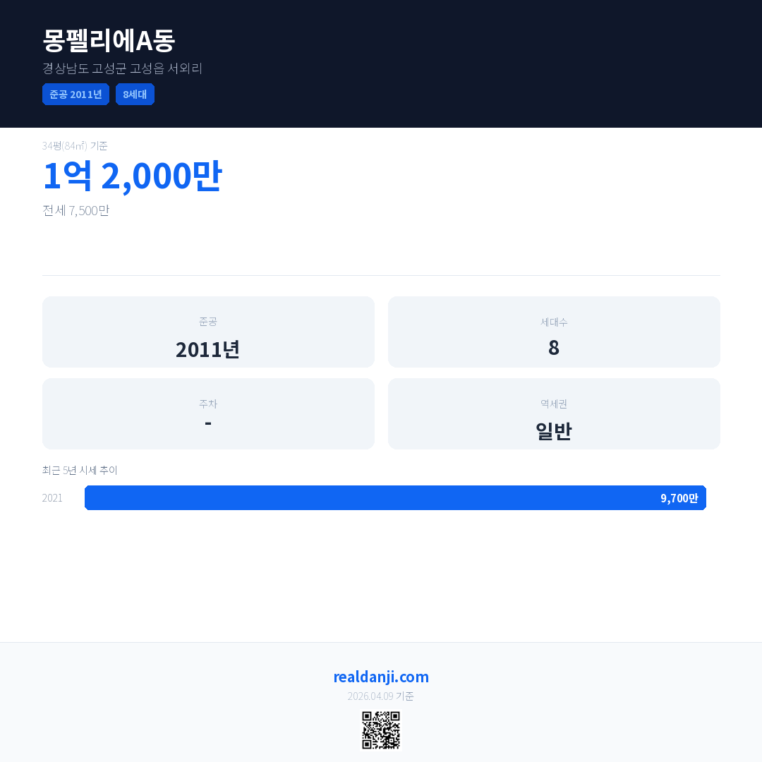 몽펠리에A동은(는) 2011년에 준공되었으며, 현재 15년차입니다. 총 8세대 규모입니다.