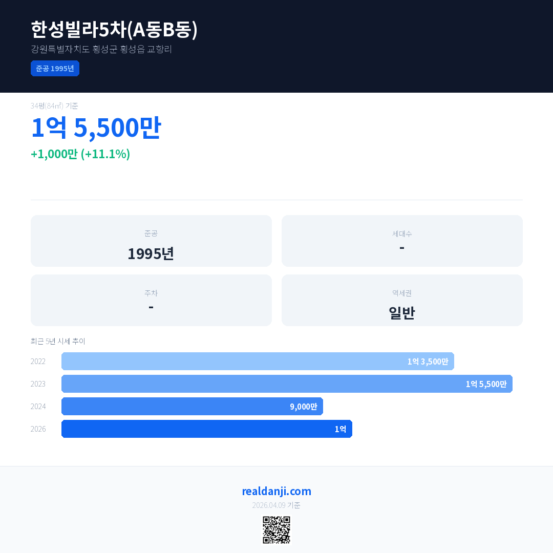 한성빌라5차(A동B동) 국민평형 기준 2026년 평균 거래가는 1억으로, 전년 대비 11.1% 상승 했습니다.