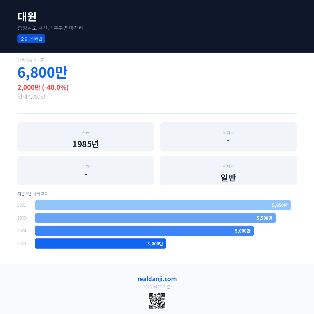 대원 국민평형 기준 2025년 평균 거래가는 3,000만으로, 전년 대비 40.0% 하락 했습니다.