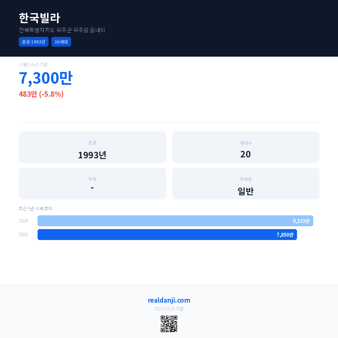 한국빌라 국민평형 기준 2025년 평균 거래가는 7,850만으로, 전년 대비 5.8% 하락 했습니다.