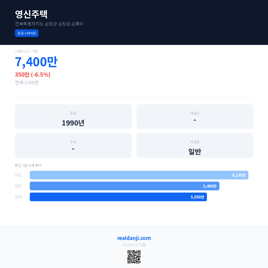 영신주택 국민평형 기준 2024년 평균 거래가는 5,050만으로, 전년 대비 6.5% 하락 했습니다.