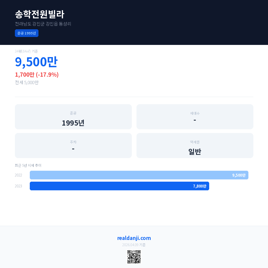 송학전원빌라 최근 거래가는 9,500만입니다. (2023-10)