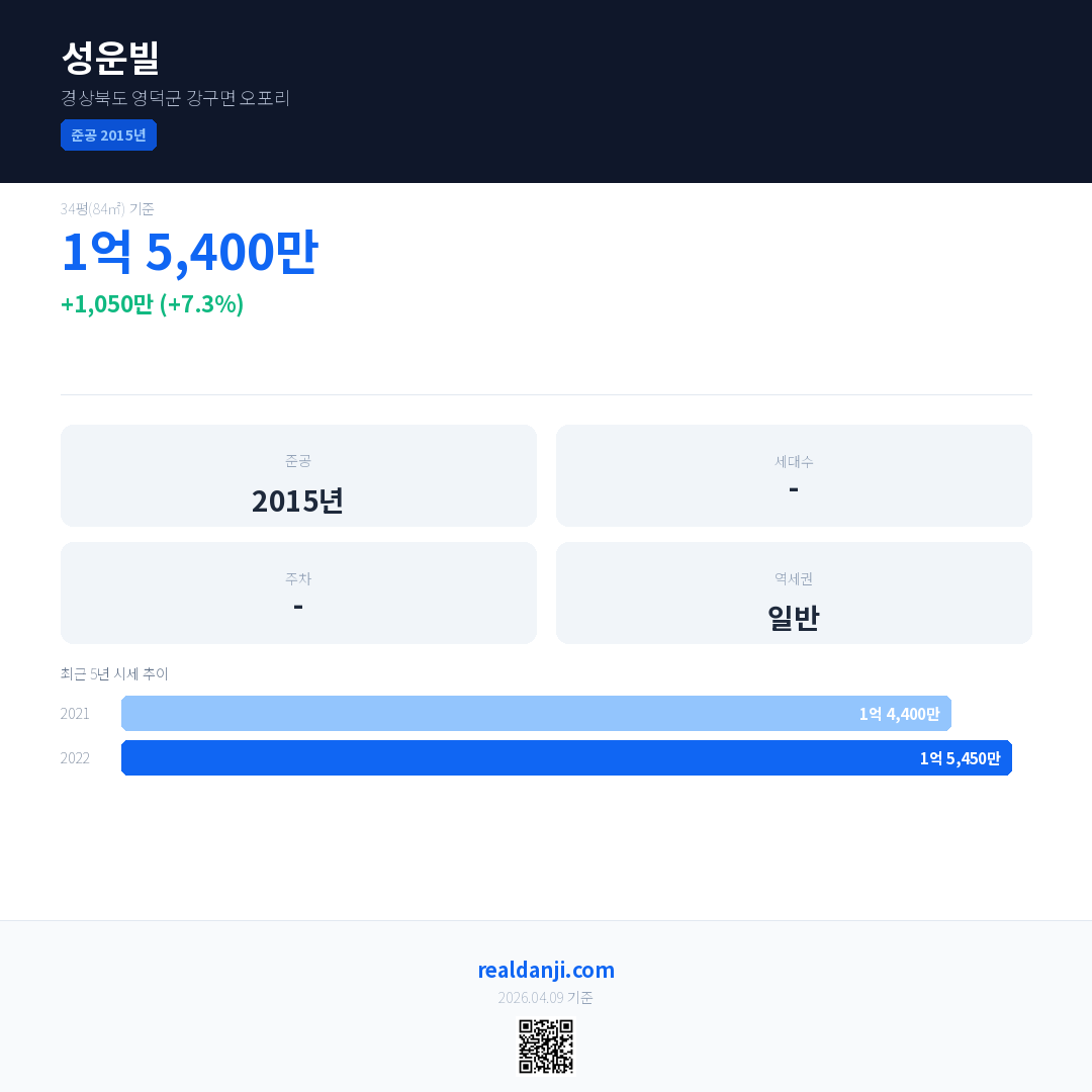 성운빌 국민평형 기준 2022년 평균 거래가는 1억 5,450만으로, 전년 대비 7.3% 상승 했습니다.