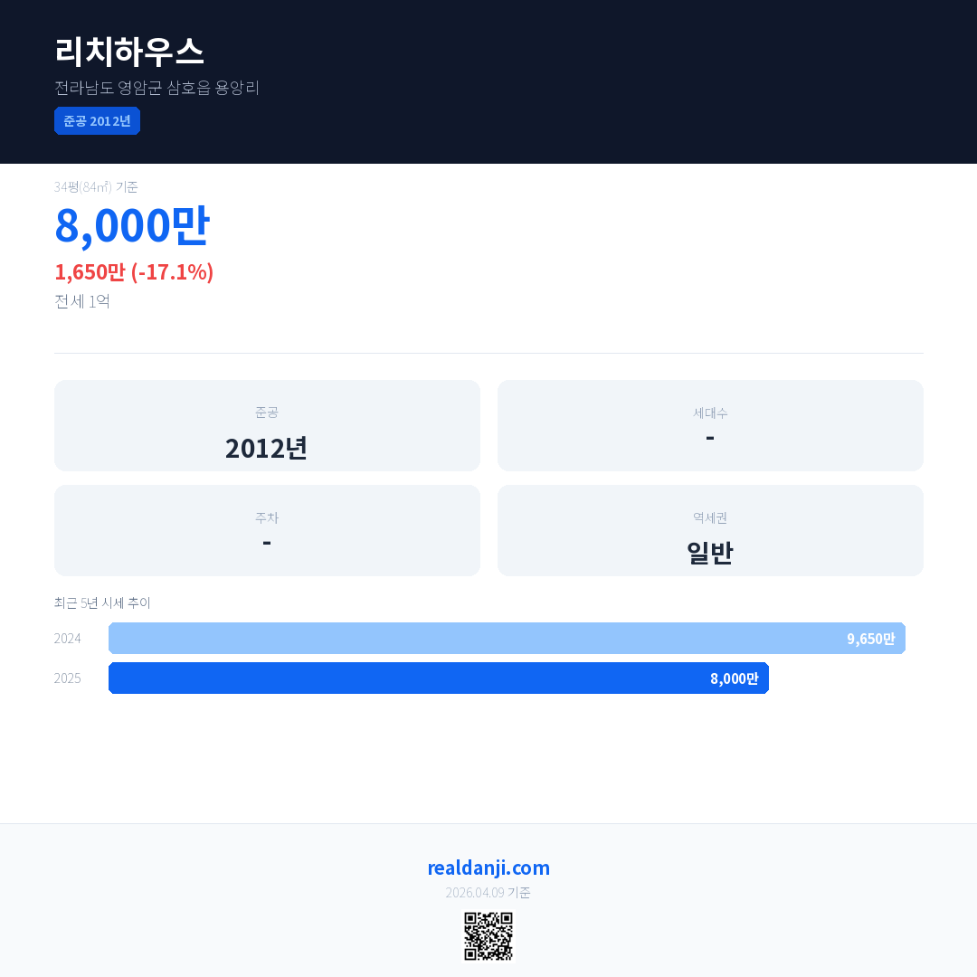 리치하우스 국민평형 기준 2025년 평균 거래가는 8,000만으로, 전년 대비 17.1% 하락 했습니다.