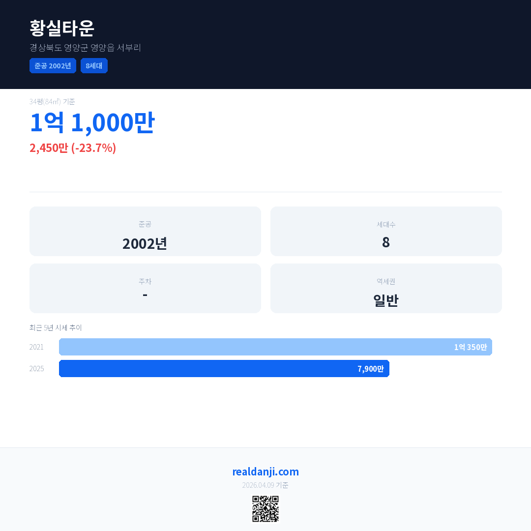 황실타운 국민평형 기준 2025년 평균 거래가는 7,900만으로, 전년 대비 23.7% 하락 했습니다.
