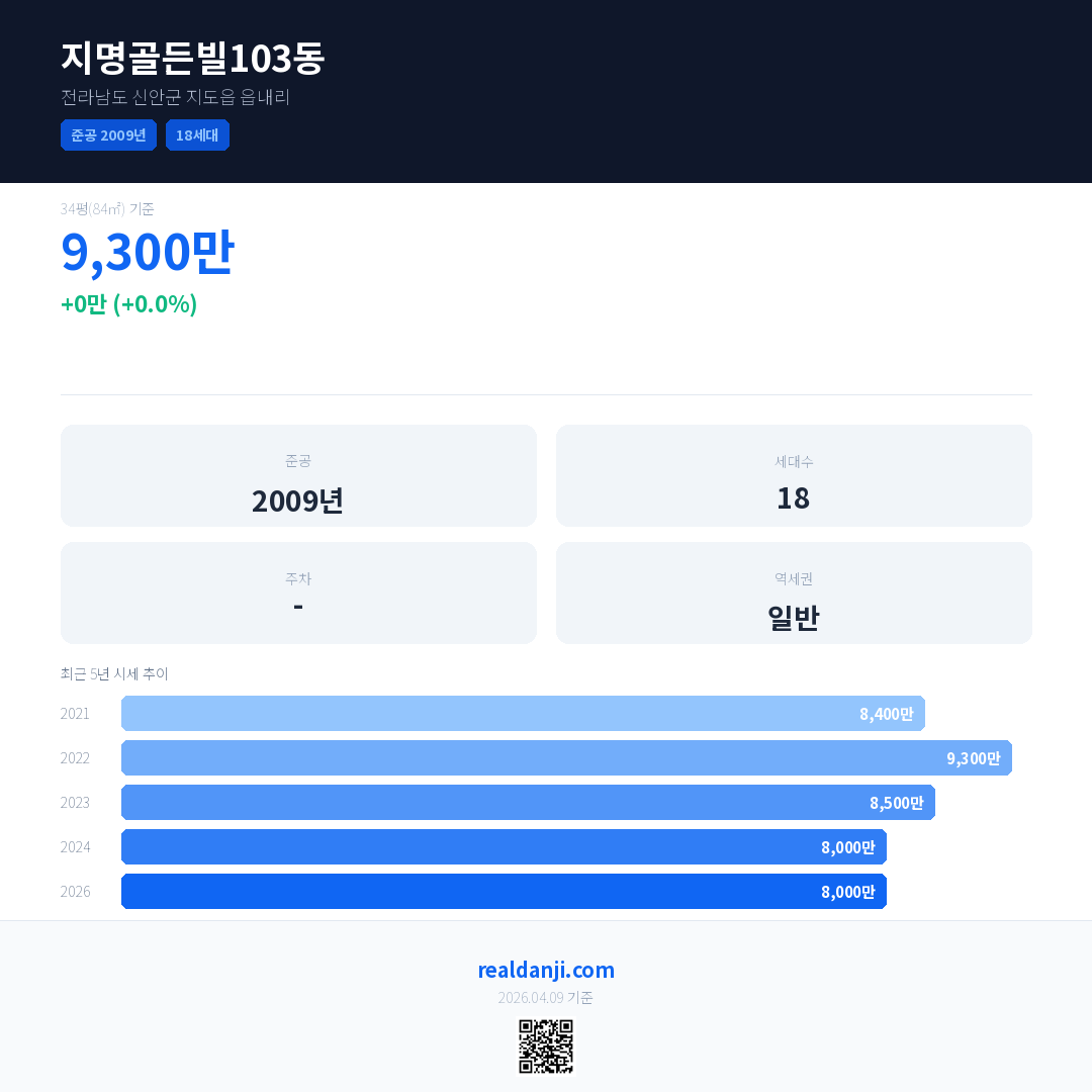 지명골든빌103동 최근 거래가는 9,300만입니다. (2026-01)