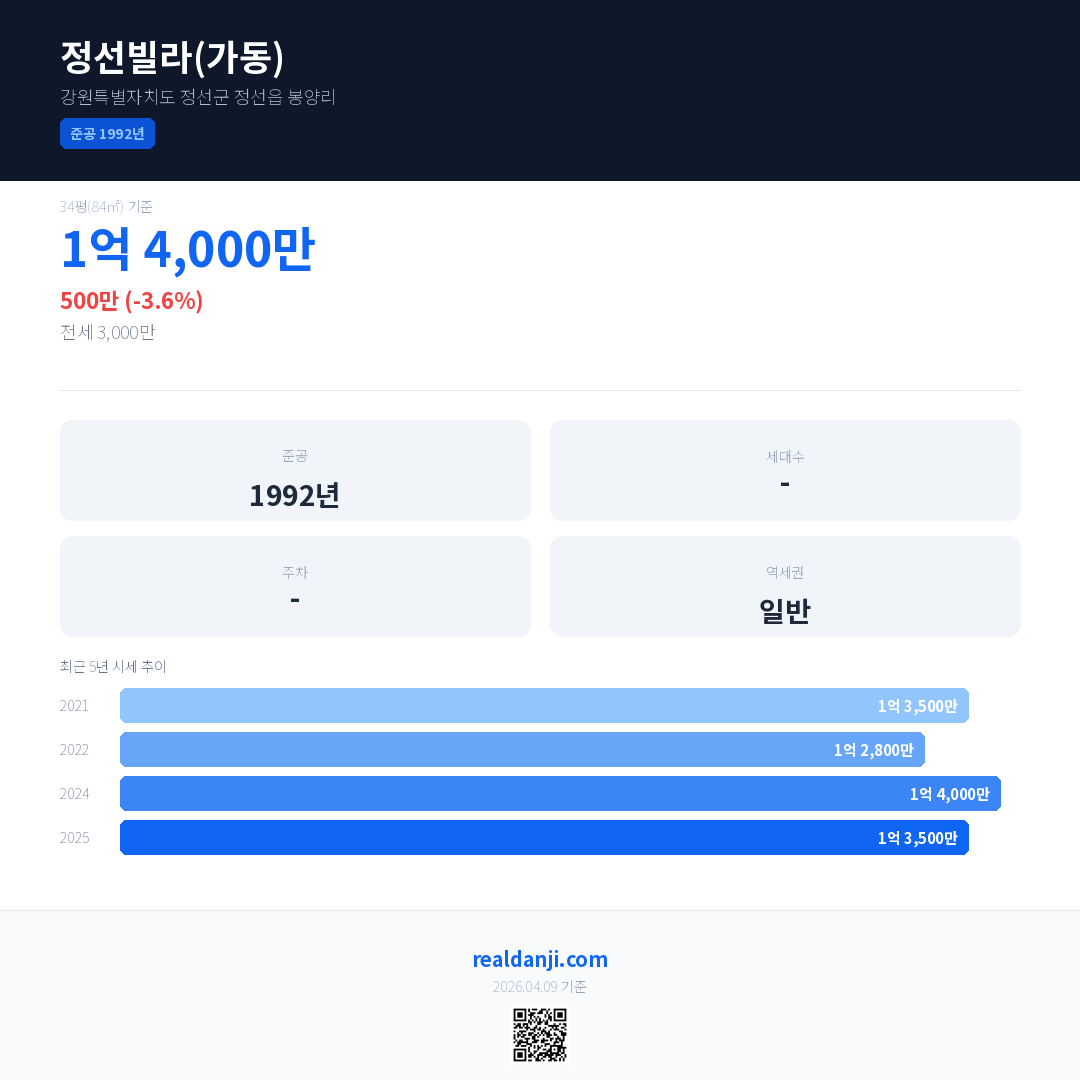 정선빌라(가동) 국민평형 기준 2025년 평균 거래가는 1억 3,500만으로, 전년 대비 3.6% 하락 했습니다.