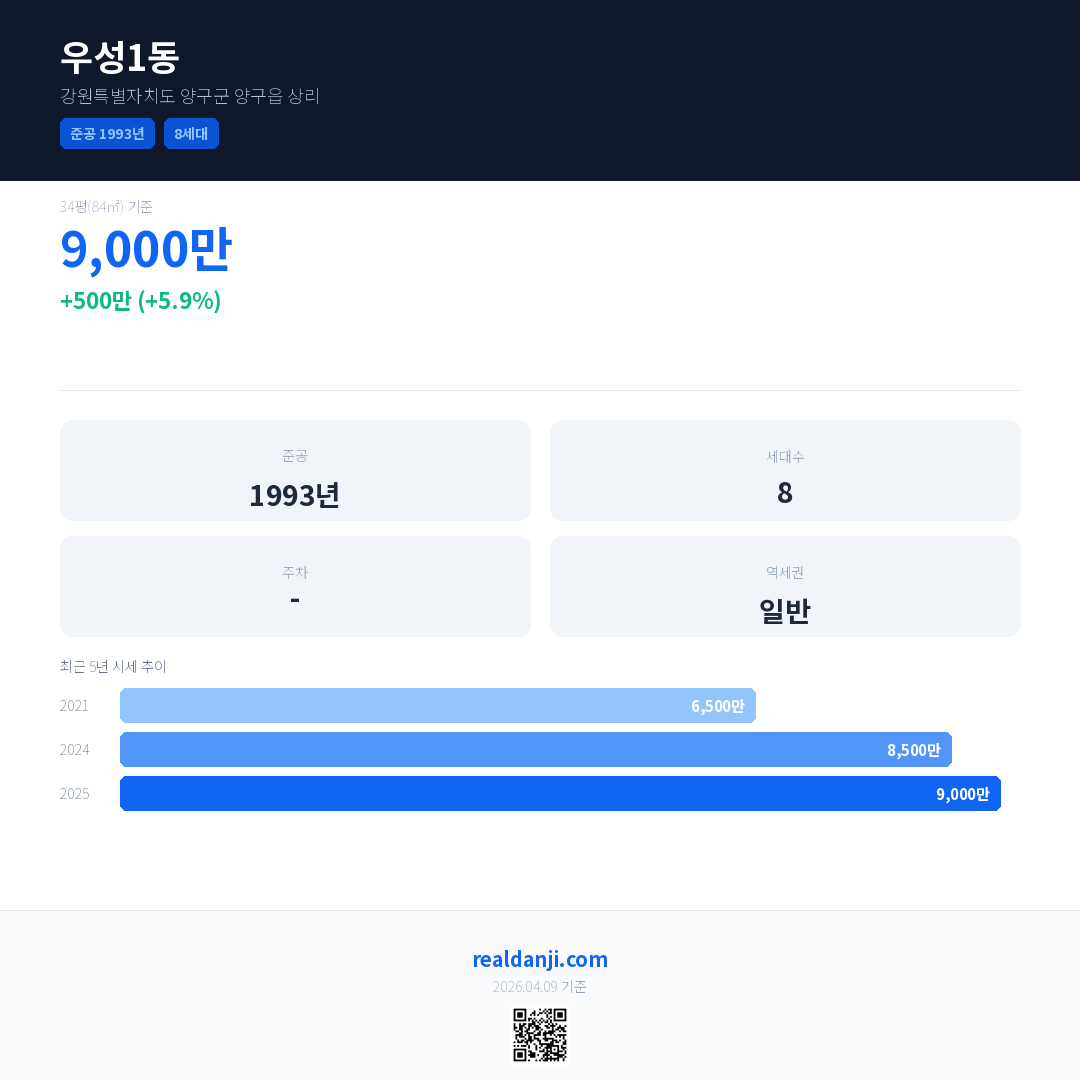 우성1동 국민평형 기준 2025년 평균 거래가는 9,000만으로, 전년 대비 5.9% 상승 했습니다.