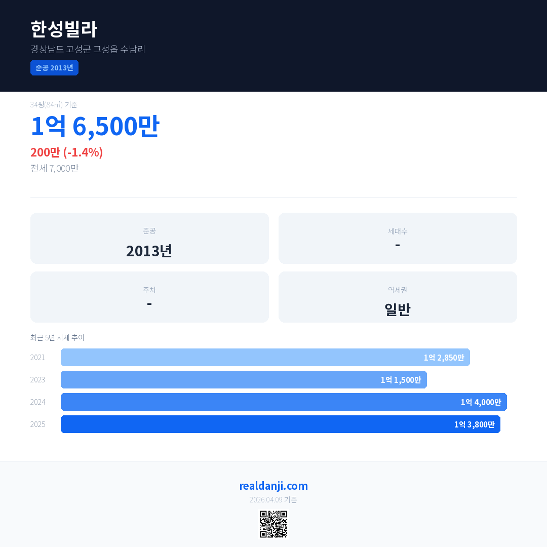 한성빌라 최근 거래가는 1억 6,500만입니다. (2025-12)