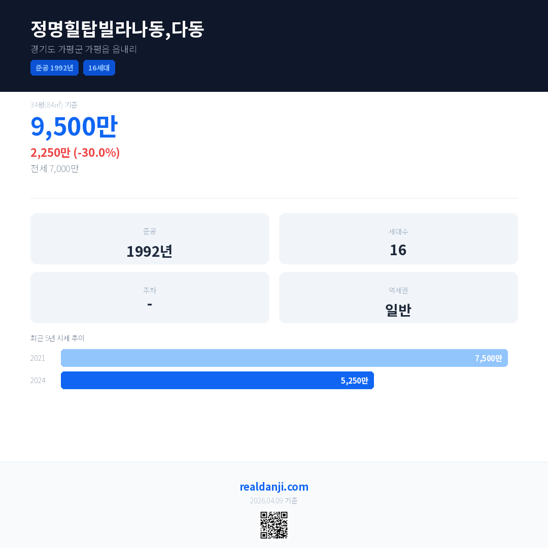 정명힐탑빌라나동,다동 최근 거래가는 9,500만입니다. (2024-08)