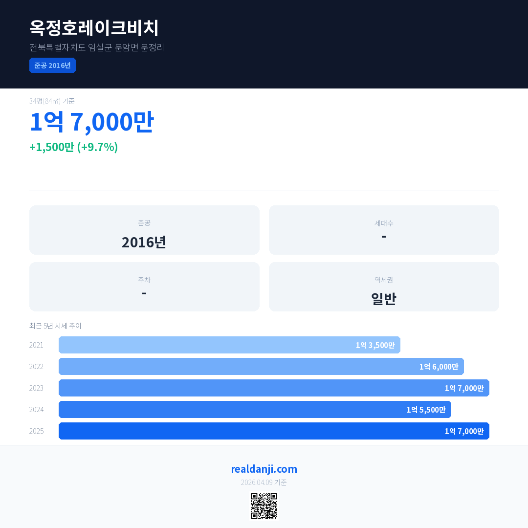 옥정호레이크비치 최근 거래가는 1억 7,000만입니다. (2025-03)