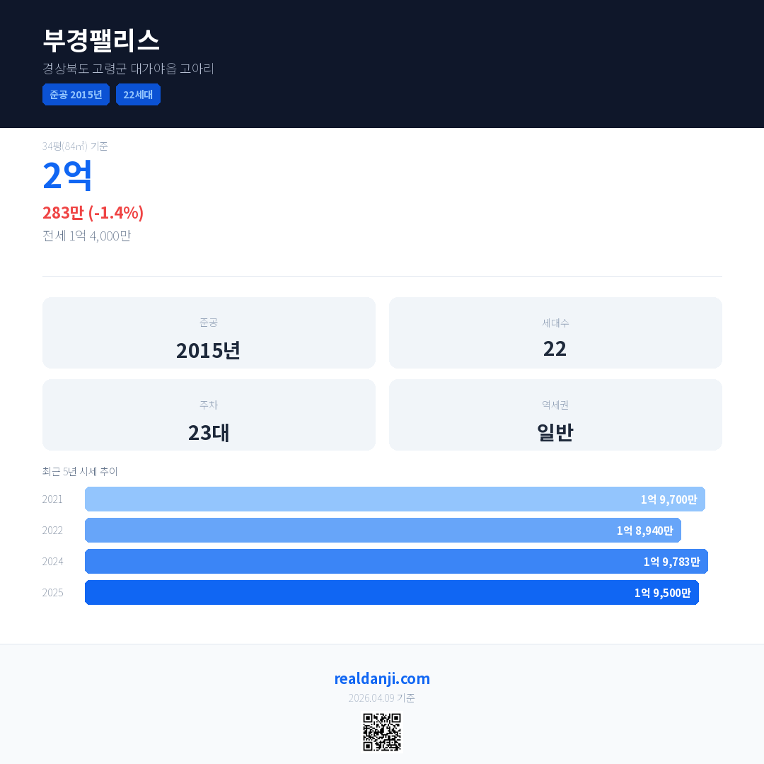부경팰리스 국민평형 기준 2025년 평균 거래가는 1억 9,500만으로, 전년 대비 1.4% 하락 했습니다.