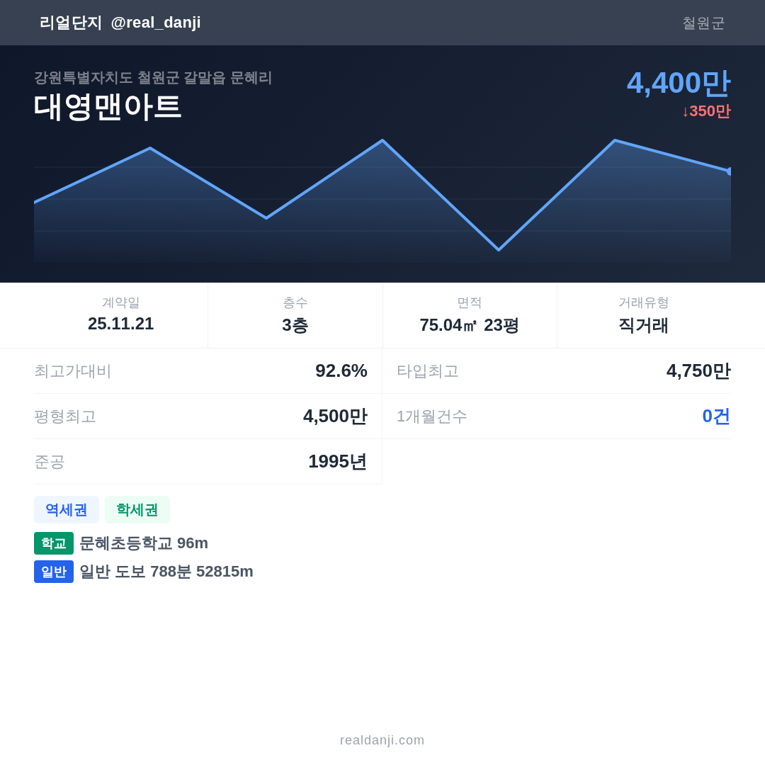 대영맨아트 국민평형 기준 2025년 평균 거래가는 4,400만으로, 전년 대비 2.2% 하락 했습니다.