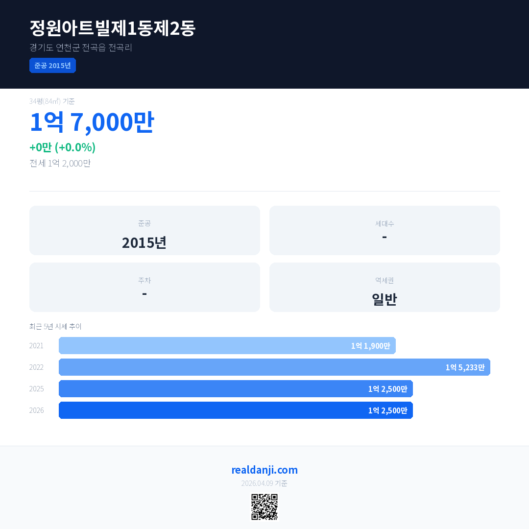 정원아트빌제1동제2동 국민평형 기준 2026년 평균 거래가는 1억 2,500만으로, 전년 대비 0.0% 하락 했습니다.