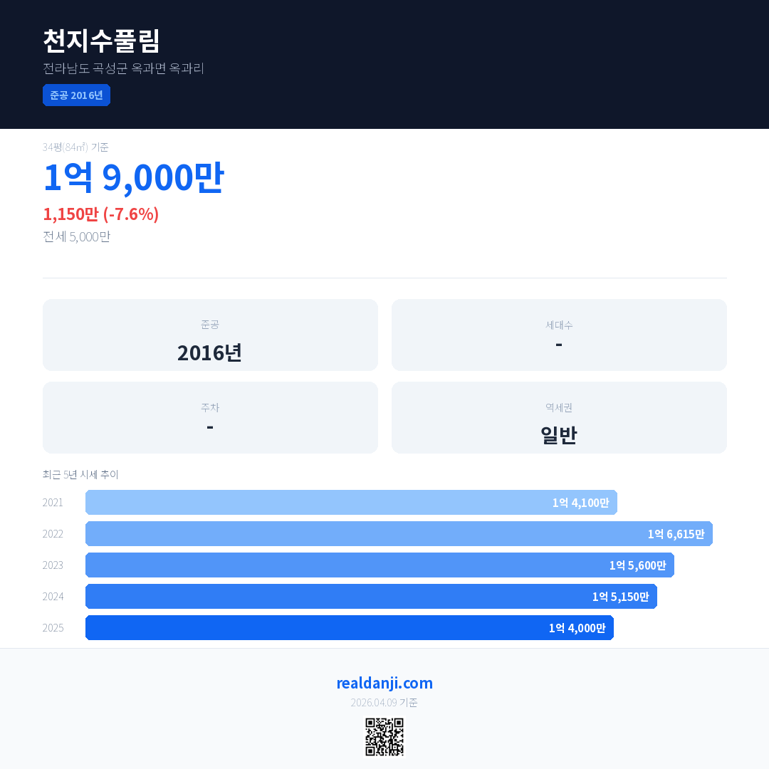 천지수풀림 국민평형 기준 2025년 평균 거래가는 1억 4,000만으로, 전년 대비 7.6% 하락 했습니다.