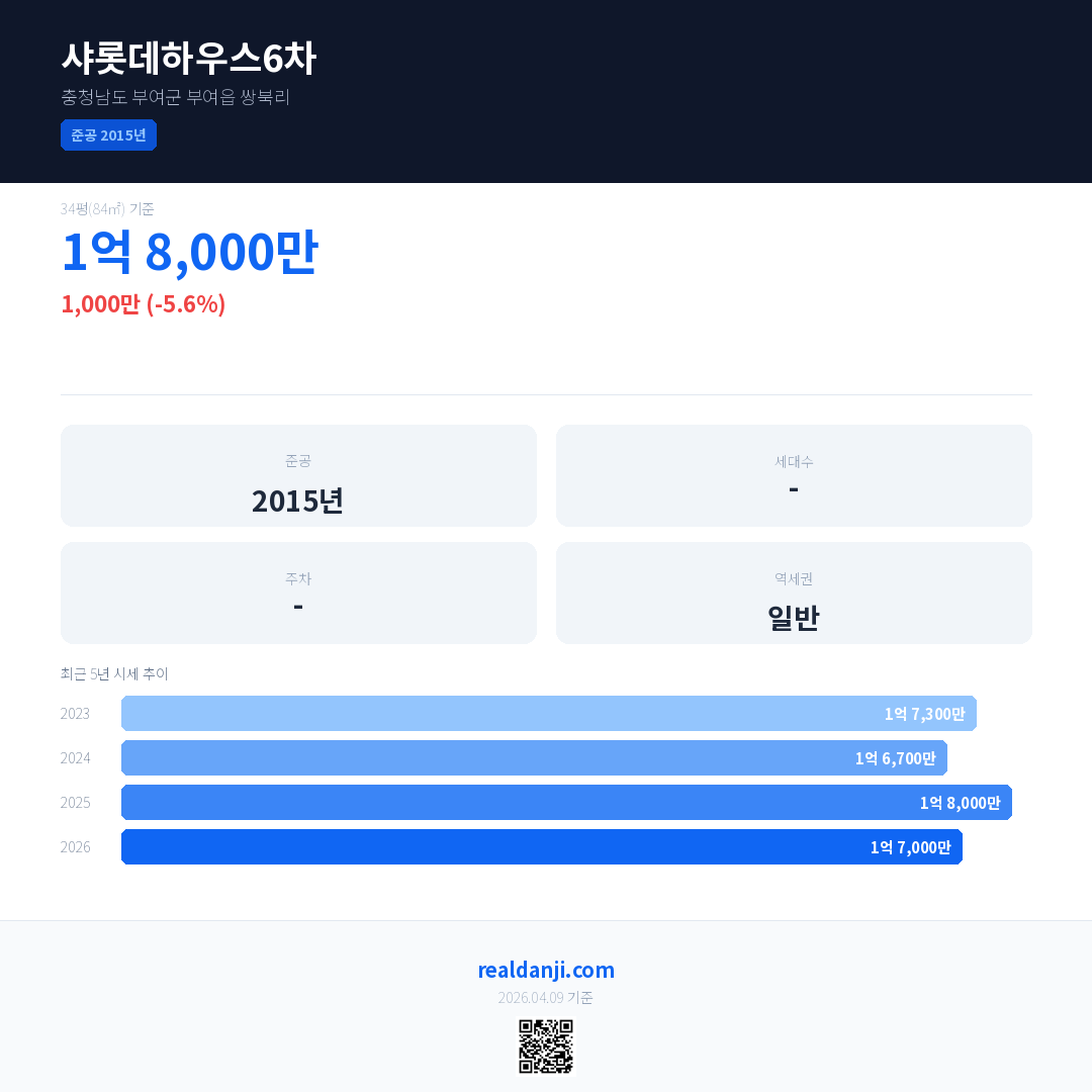 샤롯데하우스6차 국민평형 기준 2026년 평균 거래가는 1억 7,000만으로, 전년 대비 5.6% 하락 했습니다.