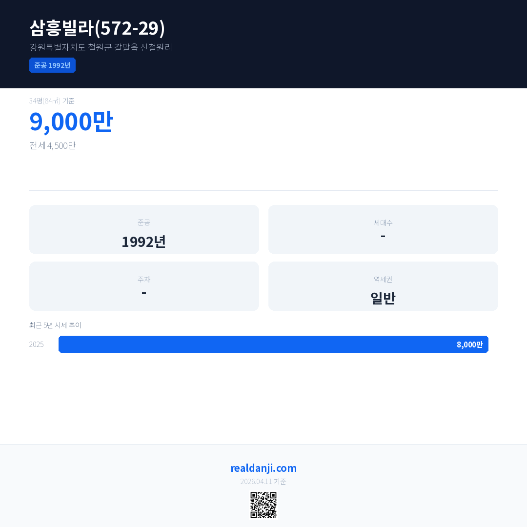 삼흥빌라(572-29) 최근 거래가는 9,000만입니다. (2026-03)