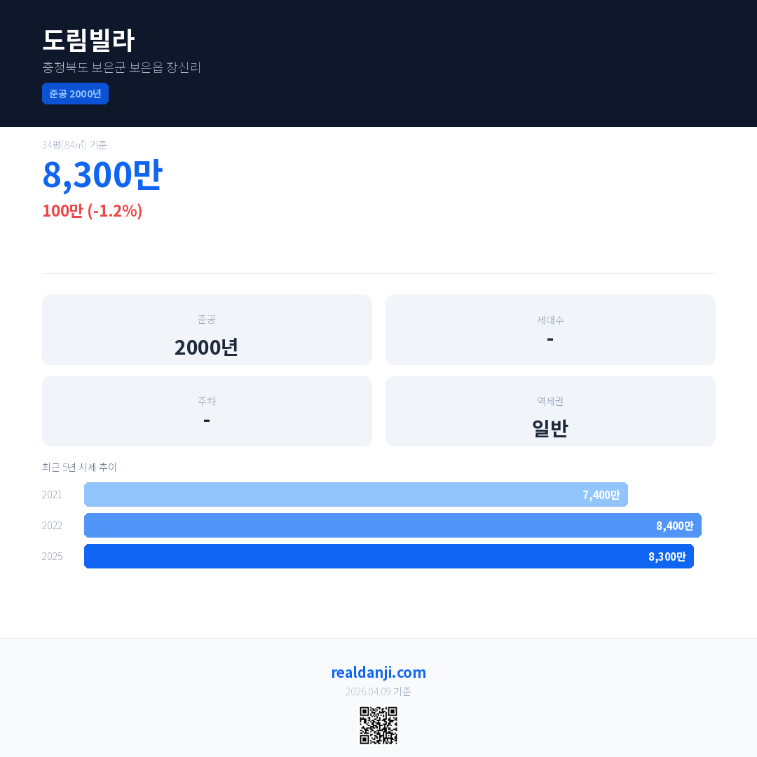 도림빌라 국민평형 기준 2025년 평균 거래가는 8,300만으로, 전년 대비 1.2% 하락 했습니다.