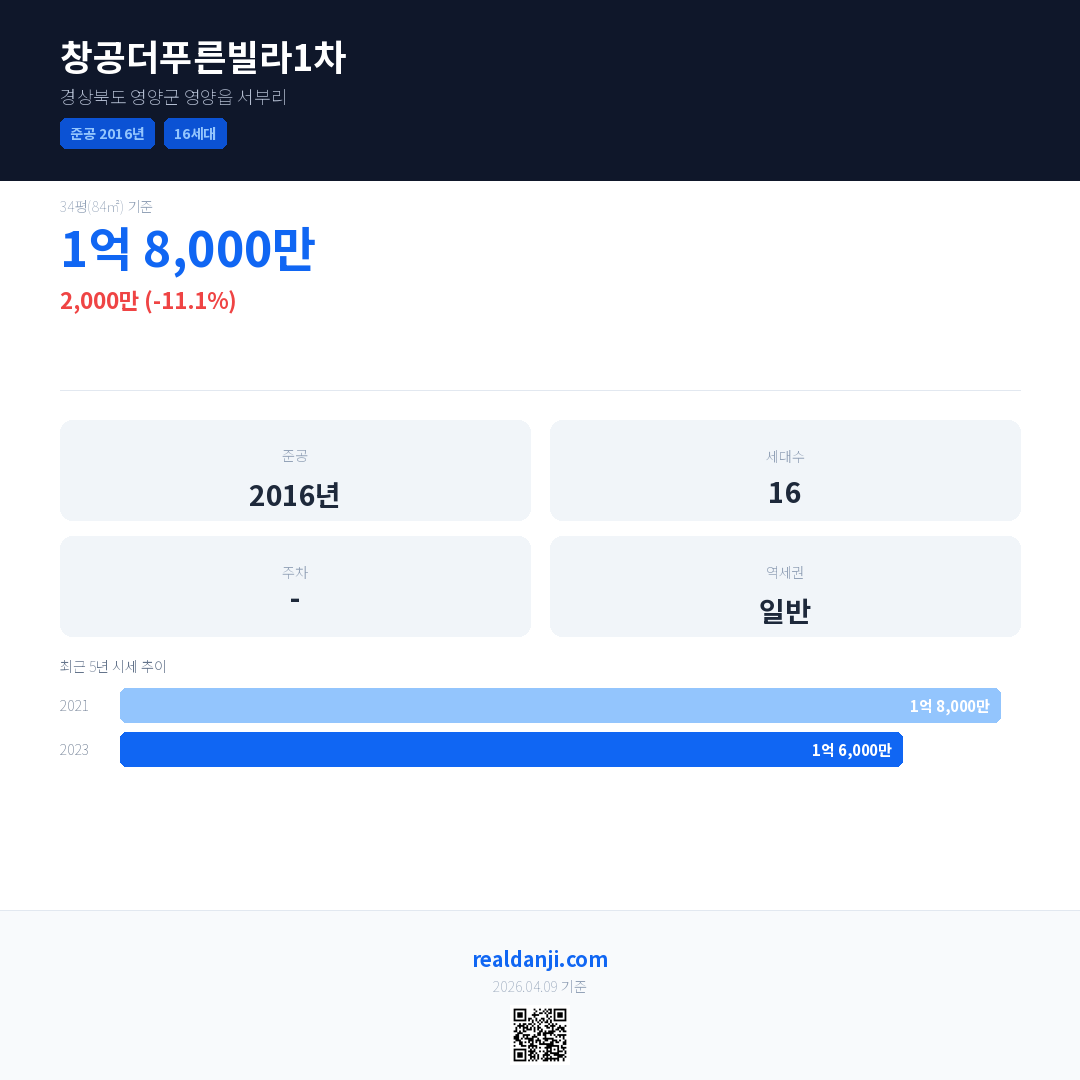 창공더푸른빌라1차은(는) 2016년에 준공되었으며, 현재 10년차입니다. 총 16세대 규모입니다.