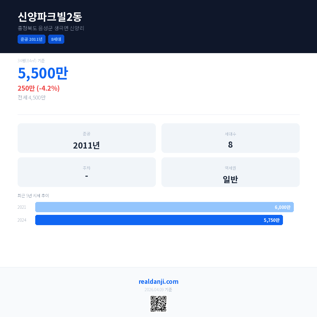 신양파크빌2동은(는) 2011년에 준공되었으며, 현재 15년차입니다. 총 8세대 규모입니다.