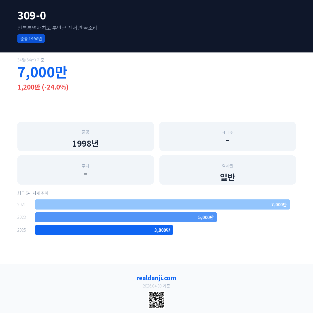 309-0 국민평형 기준 2025년 평균 거래가는 3,800만으로, 전년 대비 24.0% 하락 했습니다.