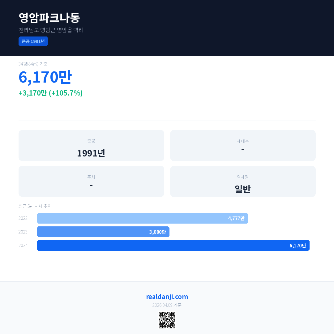 영암파크나동 최근 거래가는 6,170만입니다. (2024-07)