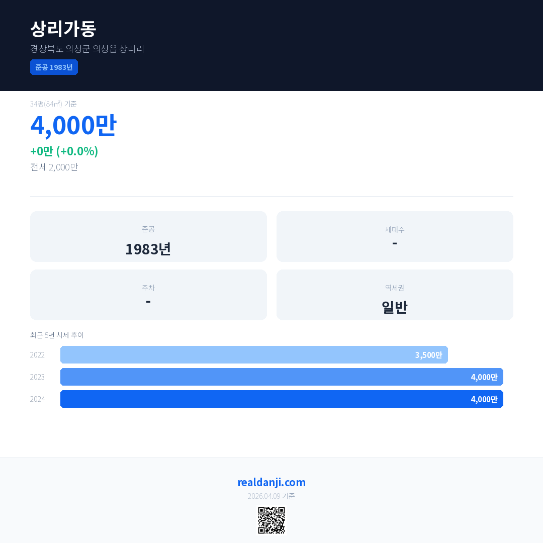상리가동 국민평형 기준 2024년 평균 거래가는 4,000만으로, 전년 대비 0.0% 하락 했습니다.