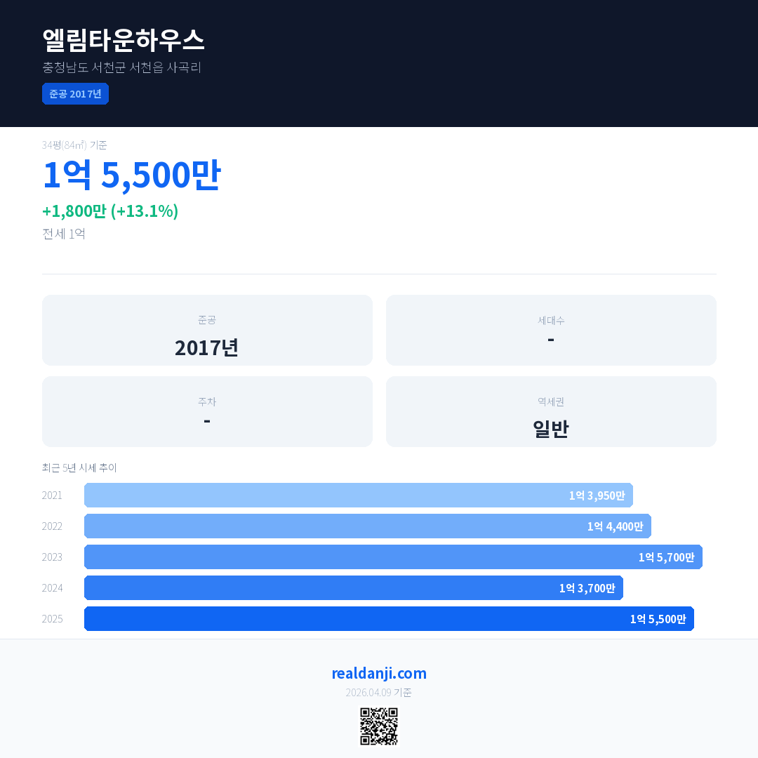 엘림타운하우스 국민평형 기준 2025년 평균 거래가는 1억 5,500만으로, 전년 대비 13.1% 상승 했습니다.