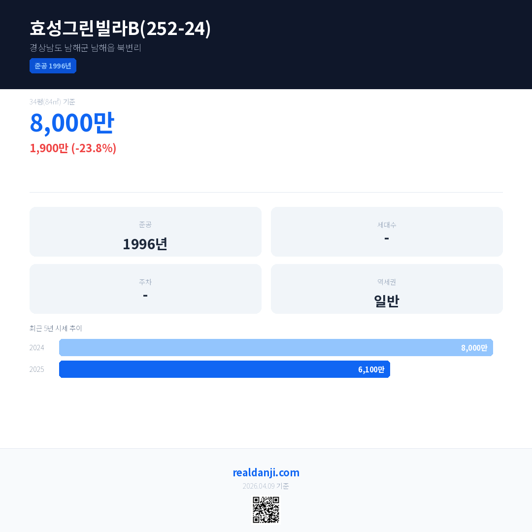 효성그린빌라B(252-24) 최근 거래가는 8,000만입니다. (2025-09)