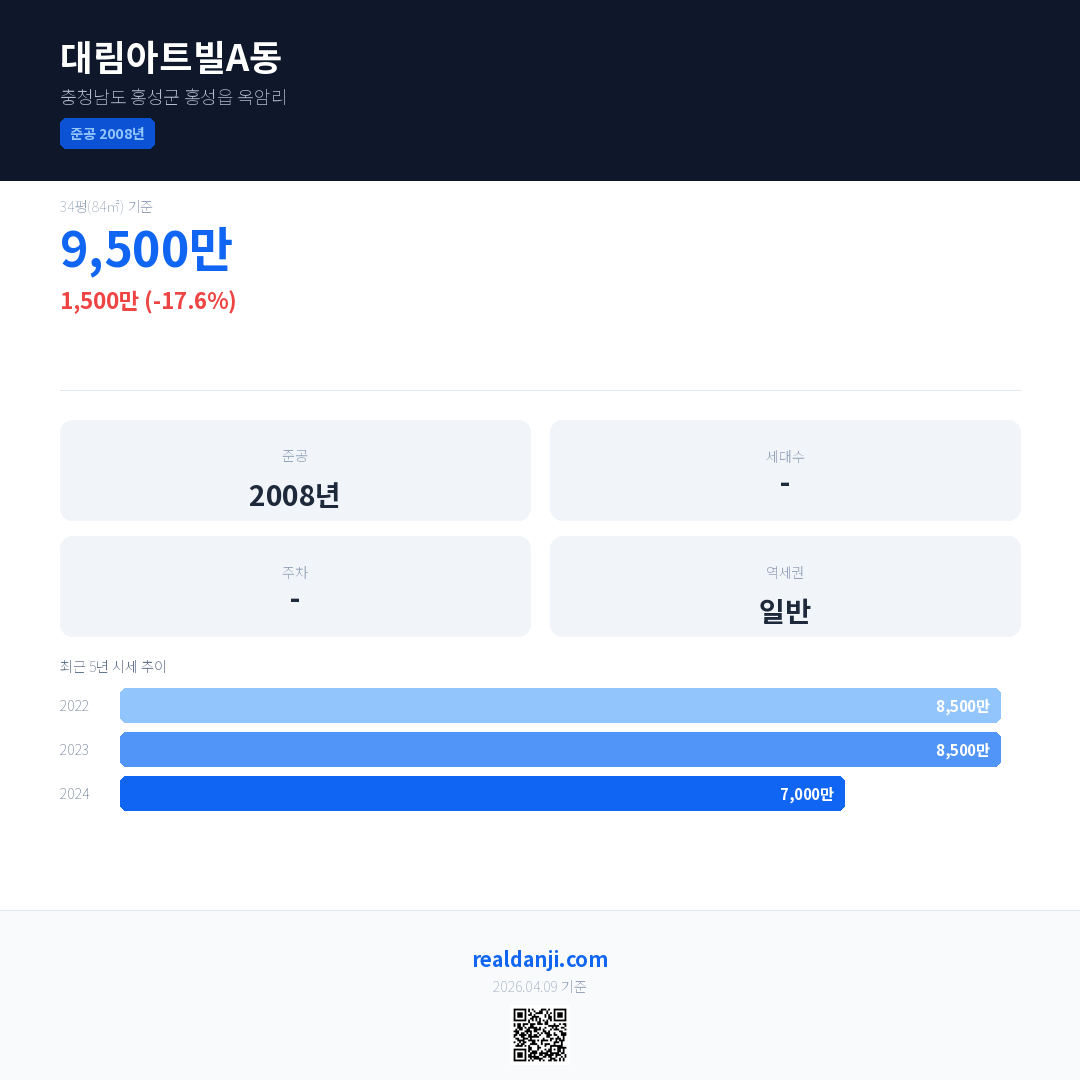 대림아트빌A동 최근 거래가는 9,500만입니다. (2024-02)