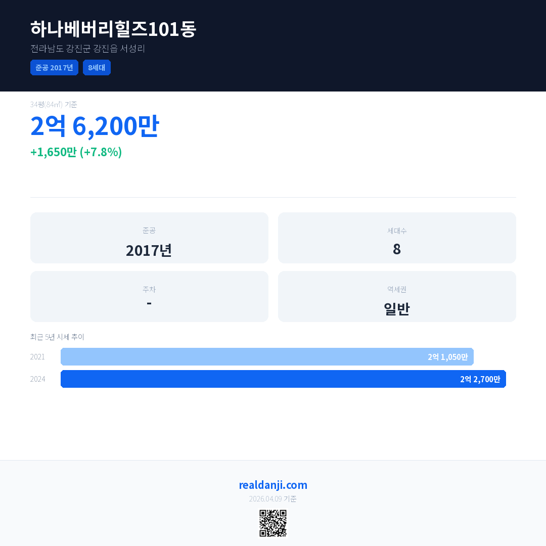 하나베버리힐즈101동 국민평형 기준 2024년 평균 거래가는 2억 2,700만으로, 전년 대비 7.8% 상승 했습니다.