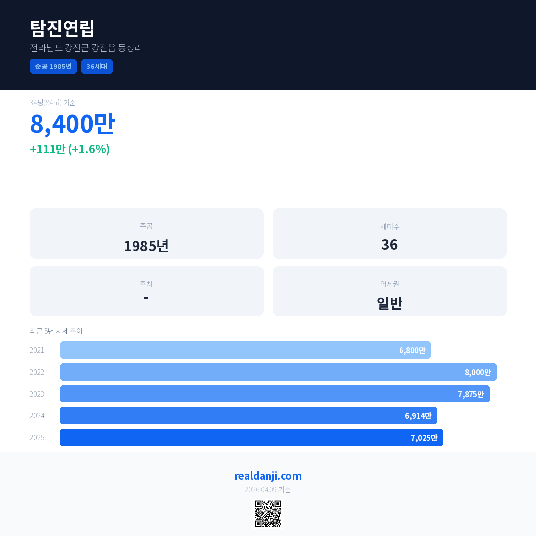 탐진연립 최근 거래가는 8,400만입니다. (2025-11)