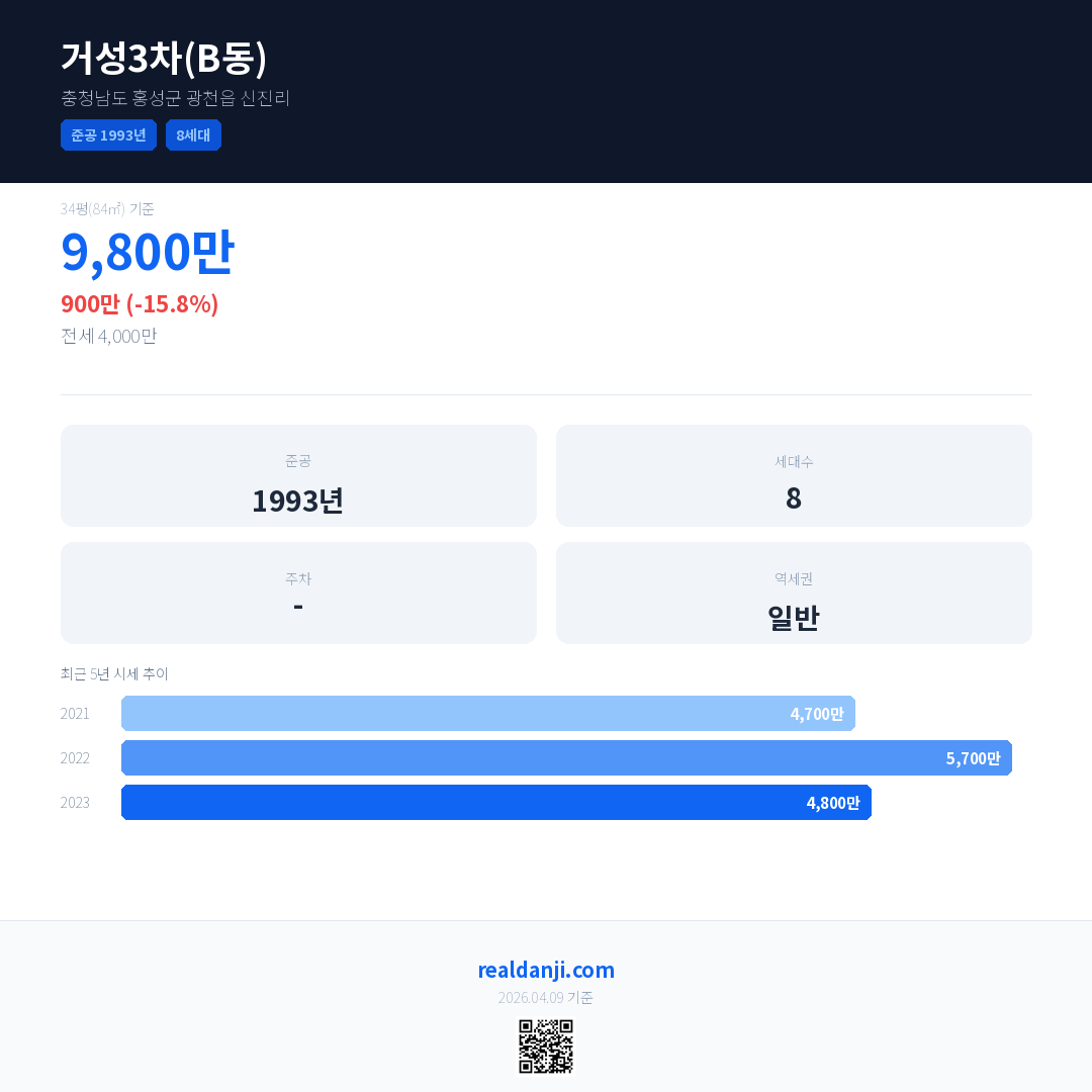 거성3차(B동) 최근 거래가는 9,800만입니다. (2024-09)