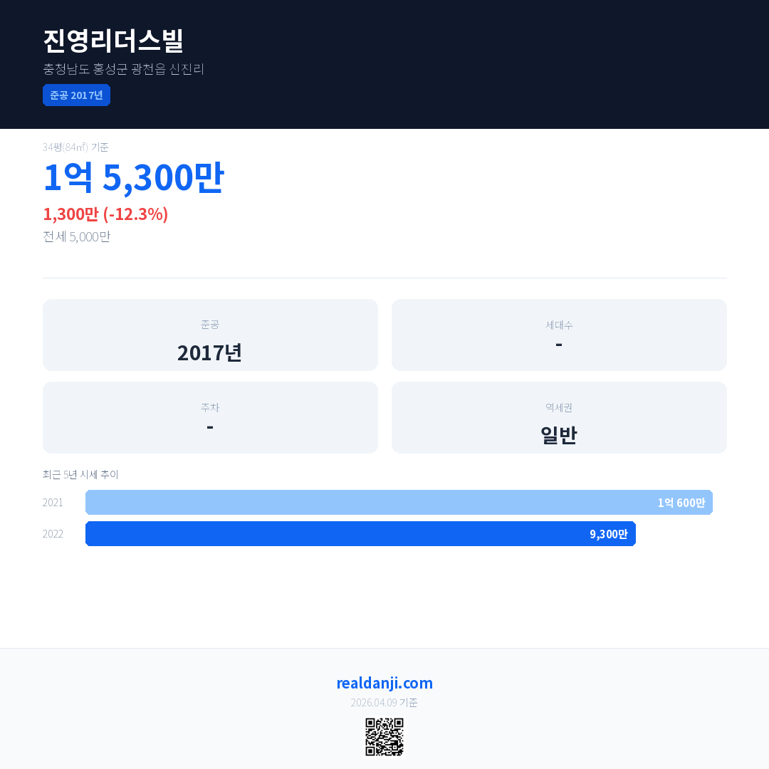 진영리더스빌 국민평형 기준 2022년 평균 거래가는 9,300만으로, 전년 대비 12.3% 하락 했습니다.