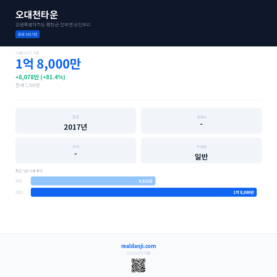 오대천타운 국민평형 기준 2023년 평균 거래가는 1억 8,000만으로, 전년 대비 81.4% 상승 했습니다.