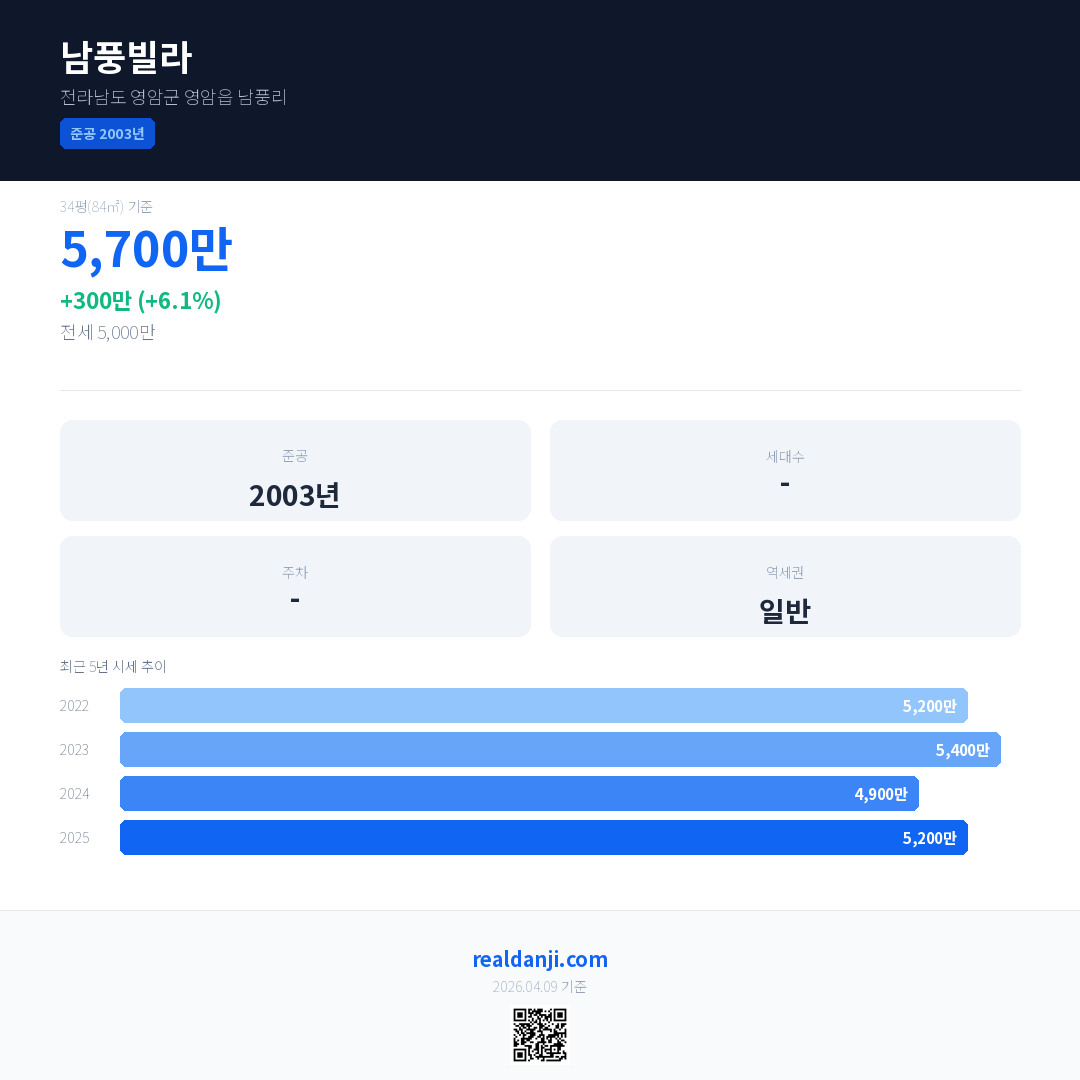 남풍빌라 국민평형 기준 2025년 평균 거래가는 5,200만으로, 전년 대비 6.1% 상승 했습니다.
