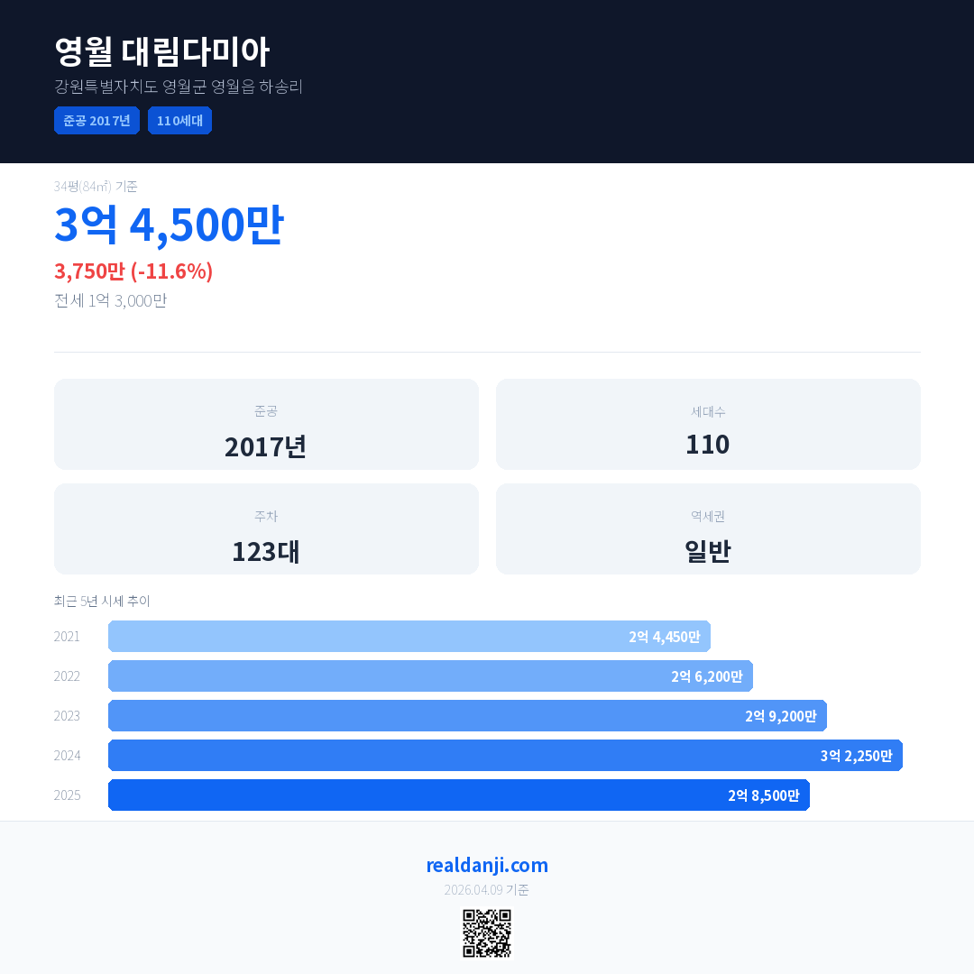 영월 대림다미아 최근 거래가는 3억 4,500만입니다. (2026-03)