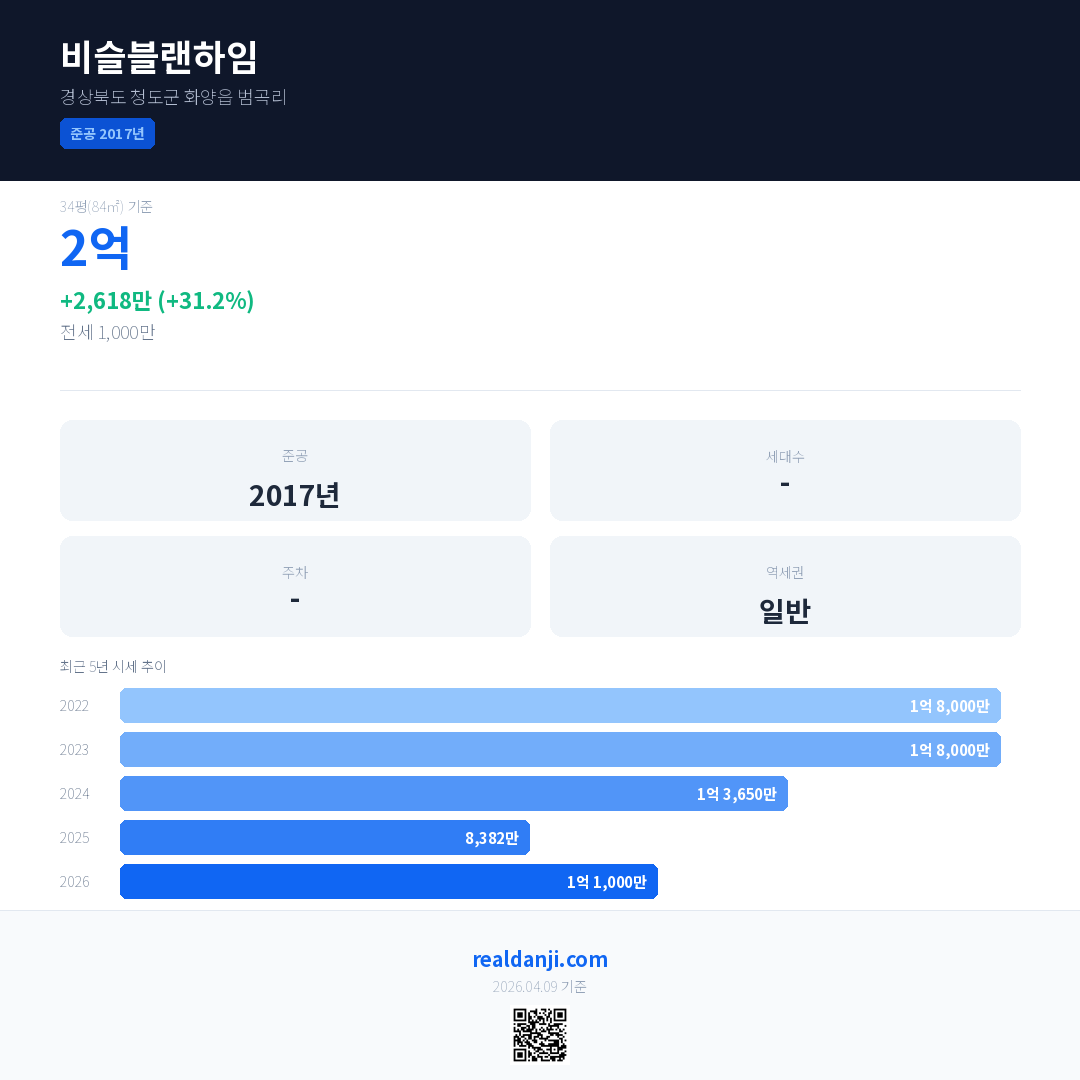 비슬블랜하임 국민평형 기준 2026년 평균 거래가는 1억 1,000만으로, 전년 대비 31.2% 상승 했습니다.