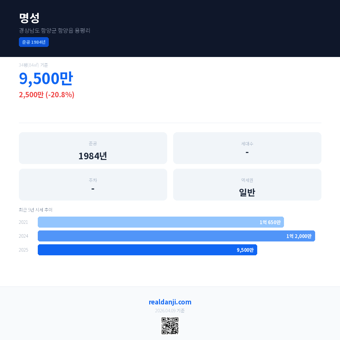 명성 국민평형 기준 2025년 평균 거래가는 9,500만으로, 전년 대비 20.8% 하락 했습니다.